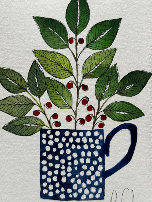 Original, A6 Watercolour Leaves in a Festive Mug.