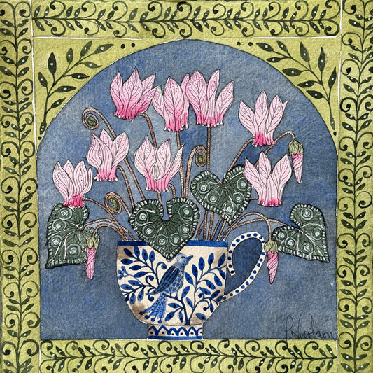 Original, Watercolour Cyclamen flowers in a Delft Teacup.