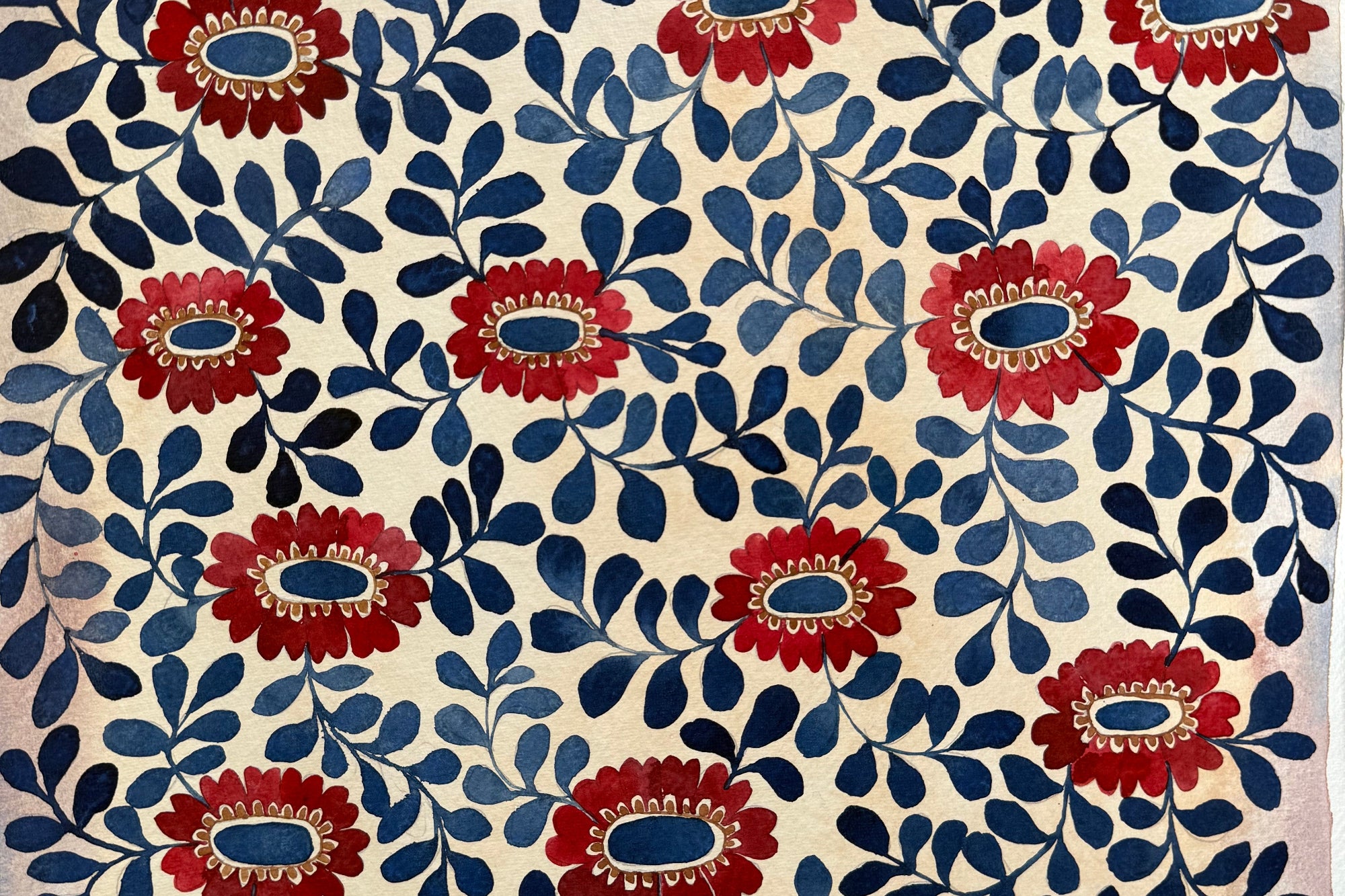 I love to create playful, patterned paintings of flowers and pottery that can bring joy and a sense of nostalgia. I use watercolour and black ink fine liner on wonderfully thick handmade cotton paper.