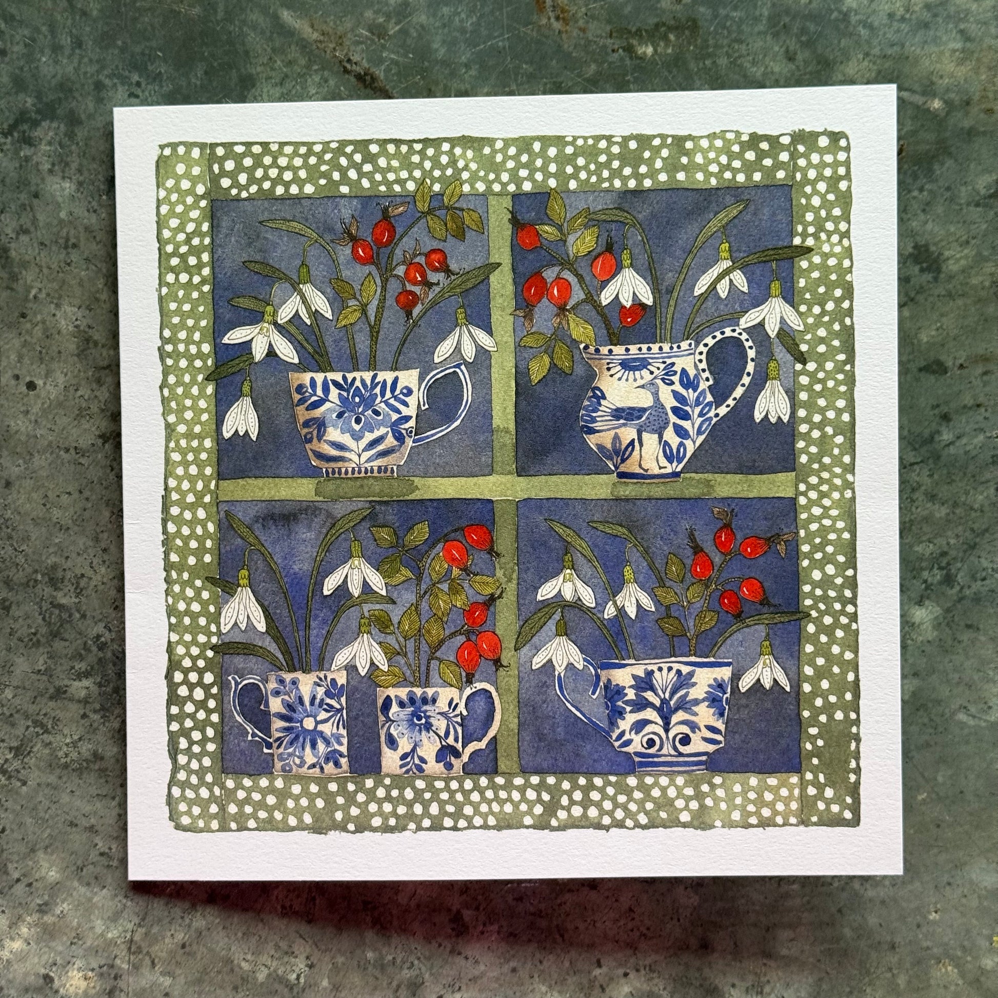 A pack of 4 Christmas cards of an original watercolour and ink painting of snowdrops and rosehips dancing out of delft teacups and mugs, displayed in a festive, snowy Window frame.