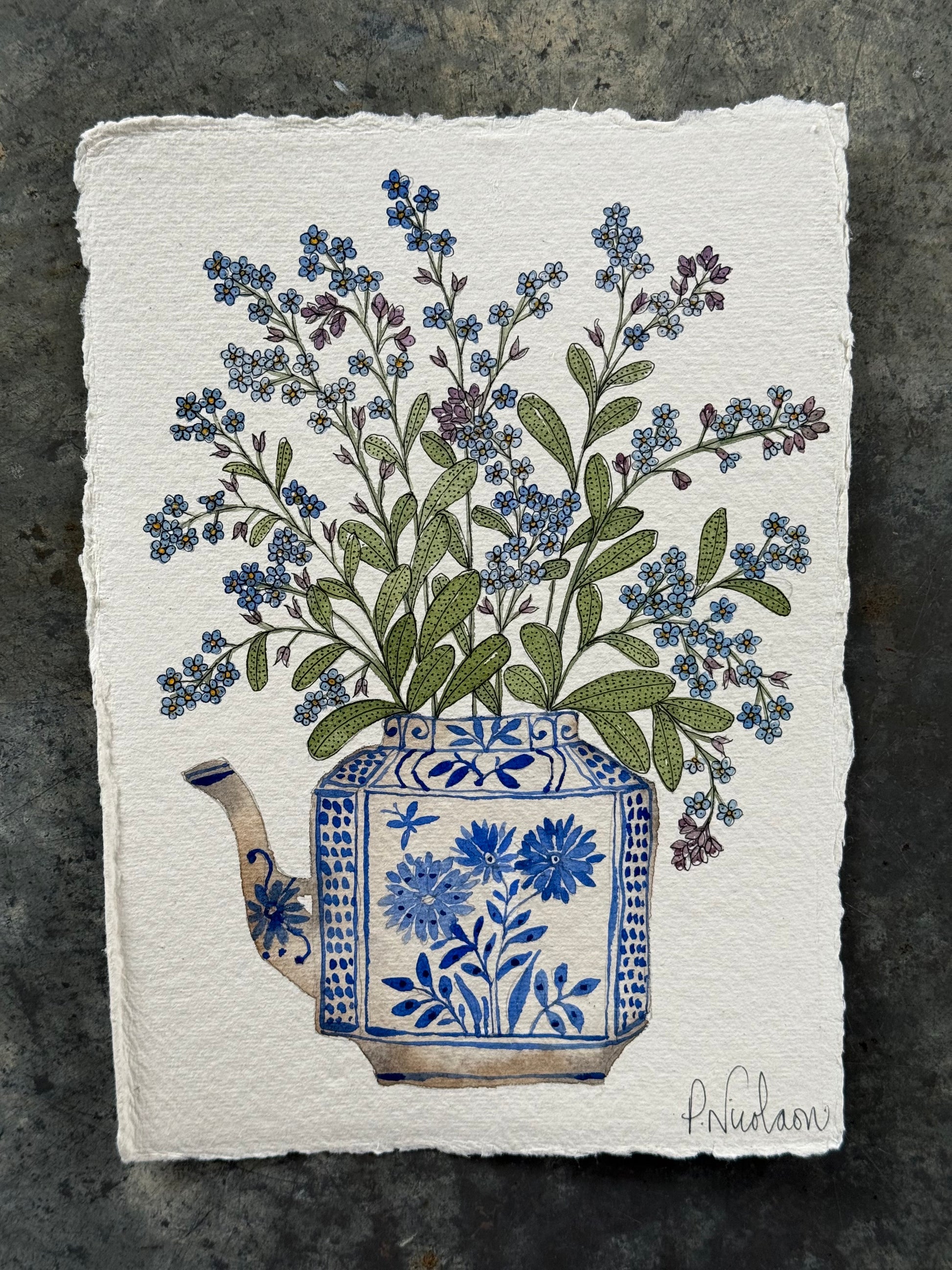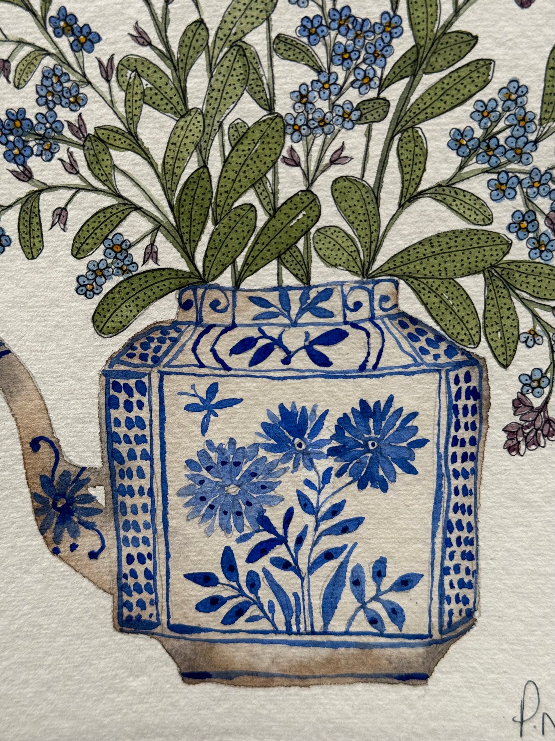 Original A5 (Approx) watercolour painting of forget me not flowers in a little teapot. The flowers are decorated with a delicate layer of black ink pattern detail.