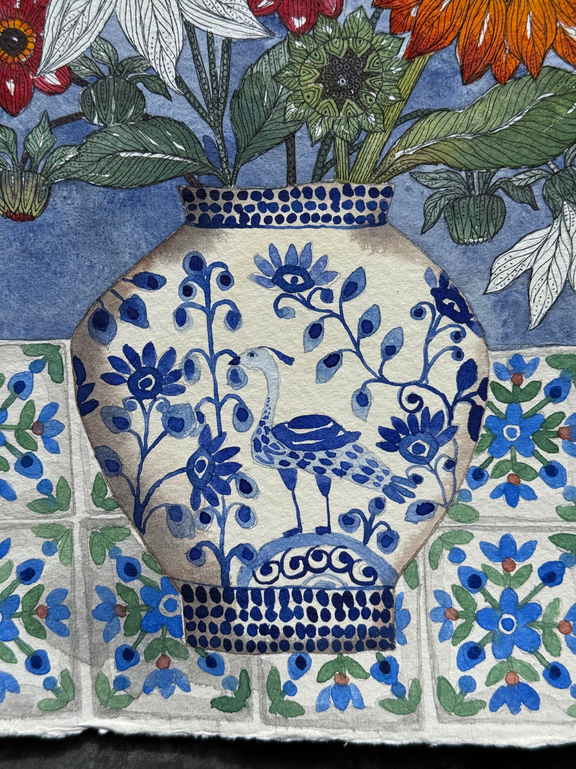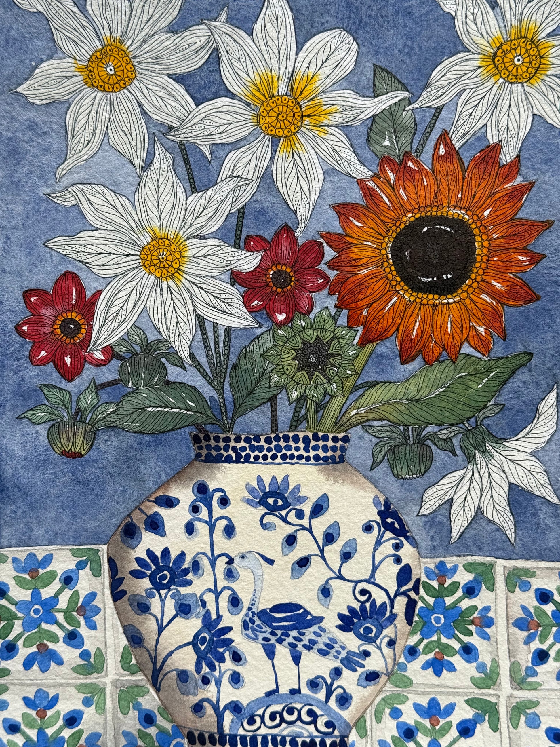 Original A4 (Approx) watercolour painting of Dahlias and a Sunflower arranged in a blue and white, inspired delft vase displayed on patterned tiles with a dark blue backwash. The flowers and foliage are decorated with a delicate layer of black ink pattern detail.
