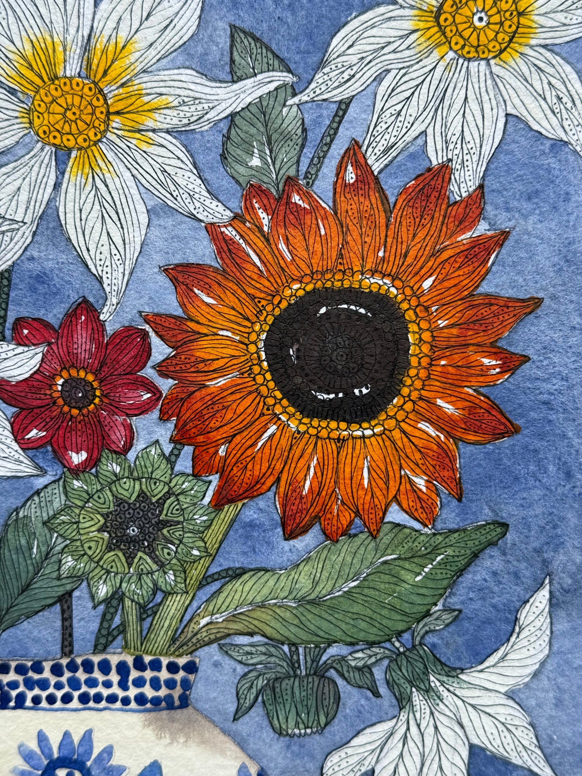 Original, A4 Watercolour Dahlias and a Sunflower in a Delft inspired Vase