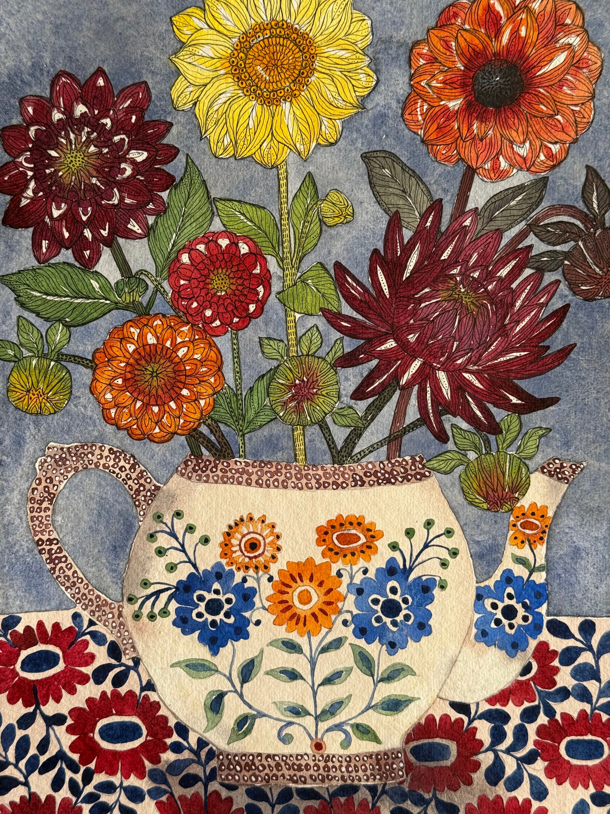 Original A4 (Approx) watercolour painting of Dahlias arranged in a patterned teapot displayed on a floral patterned table cloth with a dark blue backwash. The flowers and foliage are decorated with a delicate layer of black ink pattern detail.