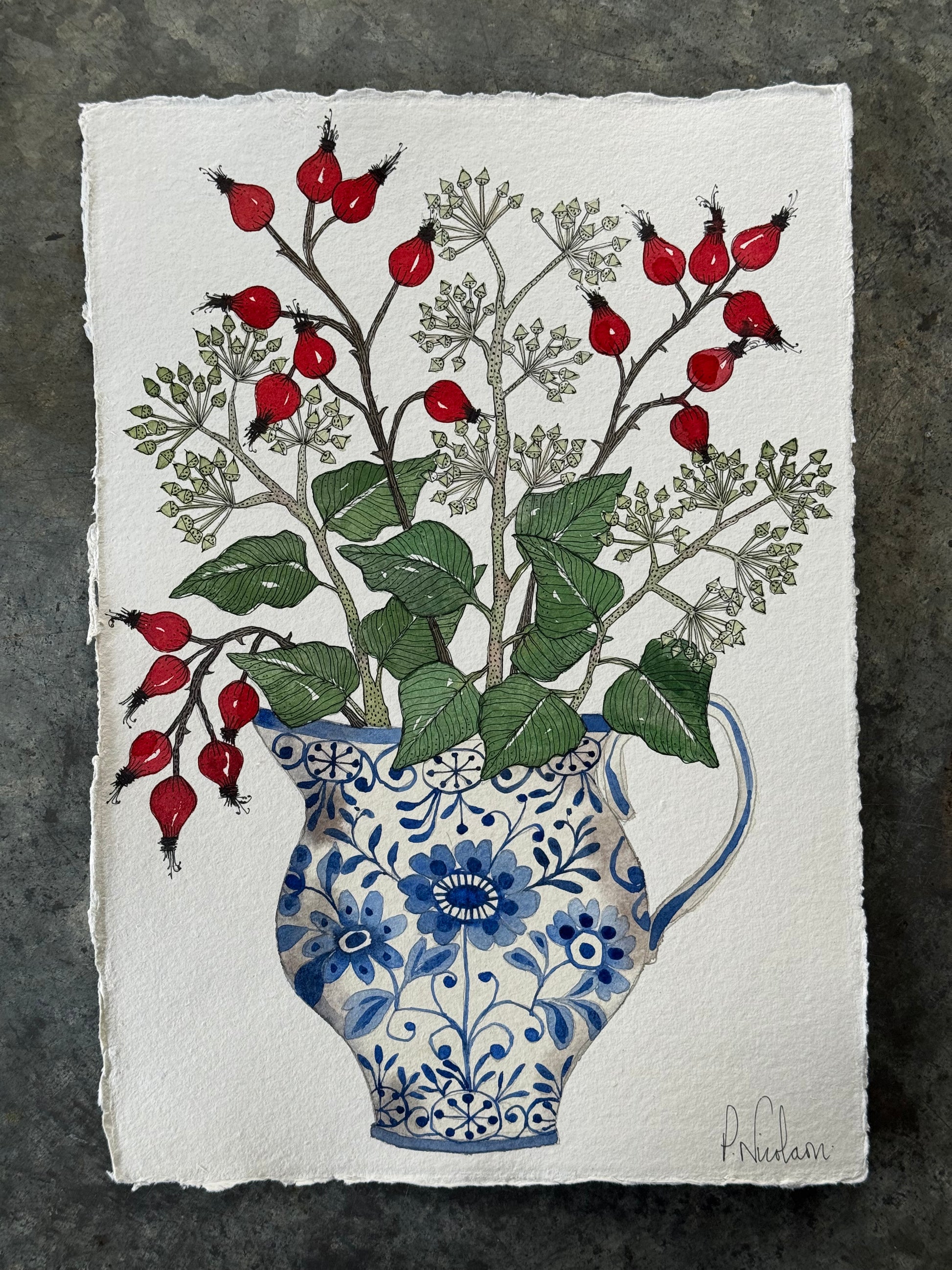 Original, A4 watercolour Ivy & Rosehips in a Delft Jug