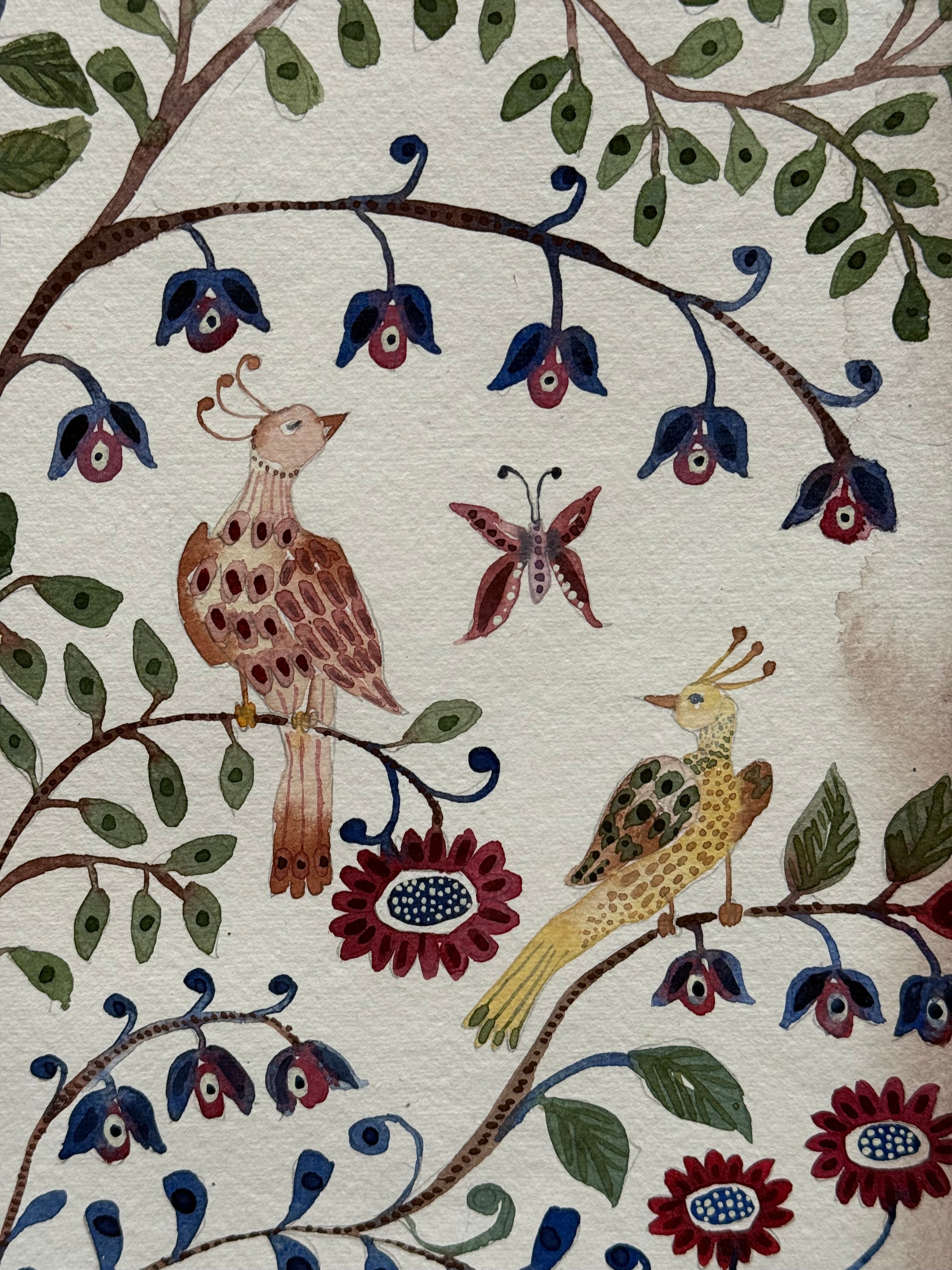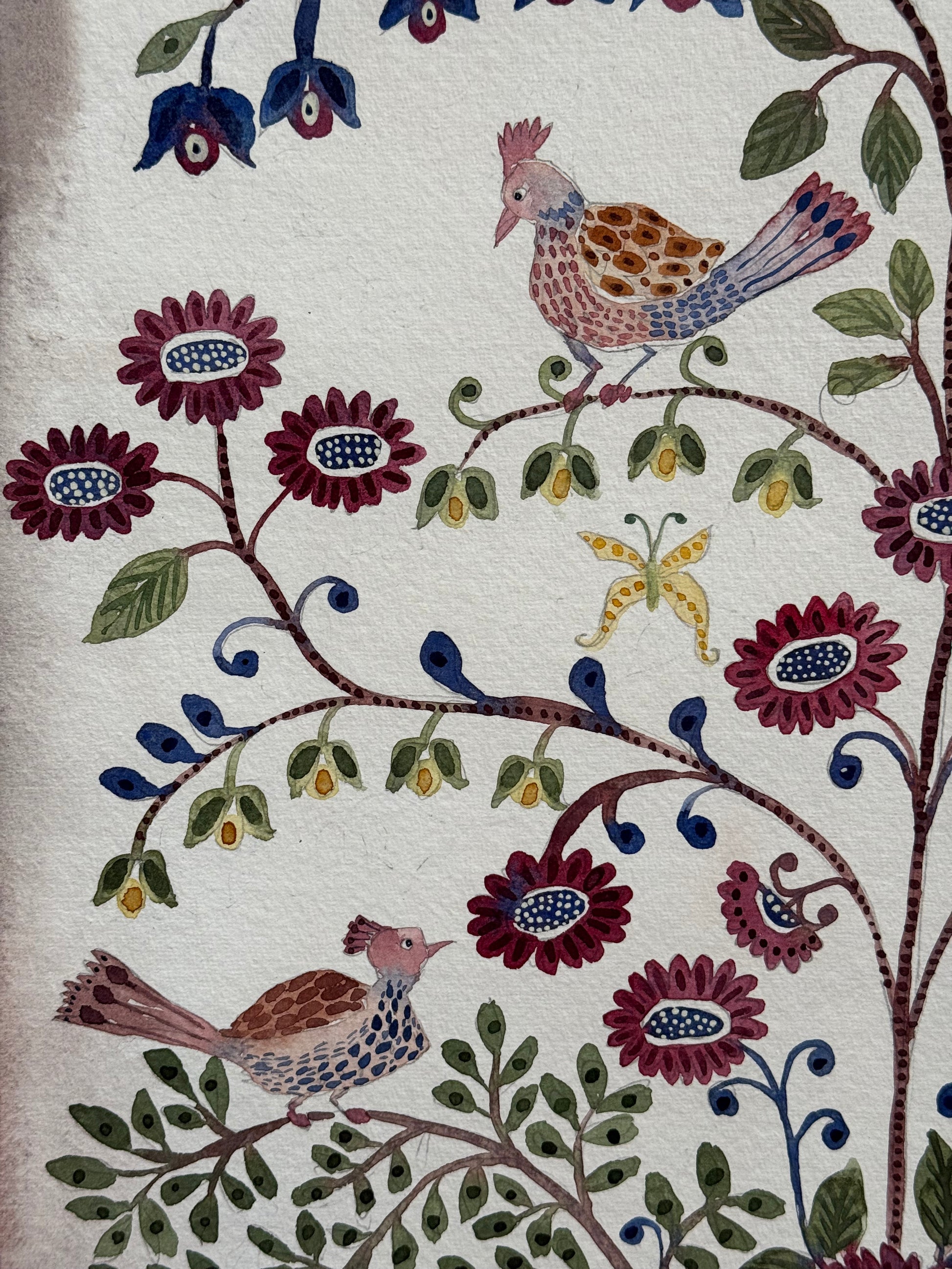 Original, watercolour painting of a floral Pattern inspired by my love of Indian Chintz Fabric and inspired from Delft patterns too. The pattern grows up the paper with little bird characters chirping to one another, perched on the branches and foliage of the pattern tree.