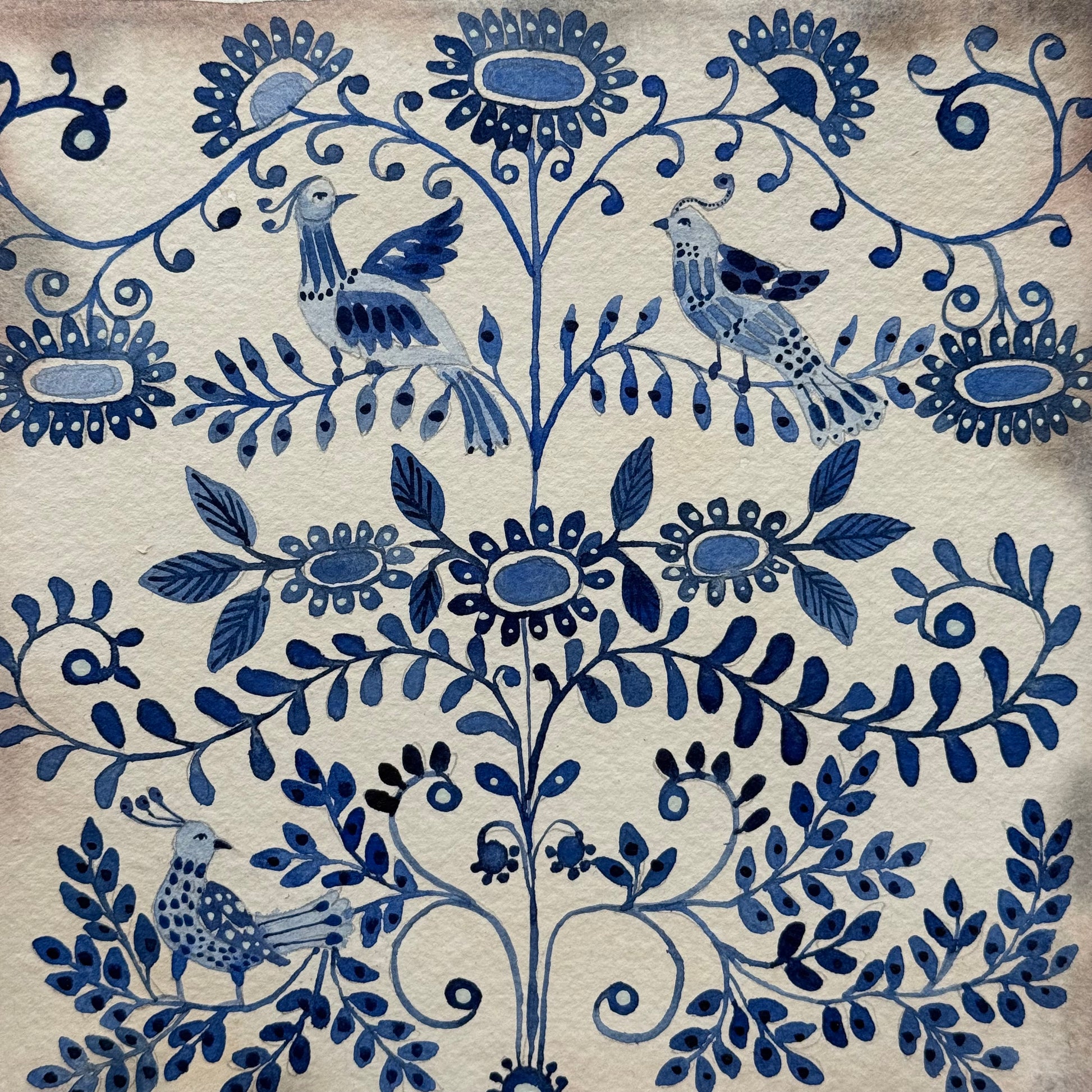 Original 20cm by 20cm (Approx) watercolour painting of pretty blue floral patterns with delft inspired birds perched on the patterns branches.