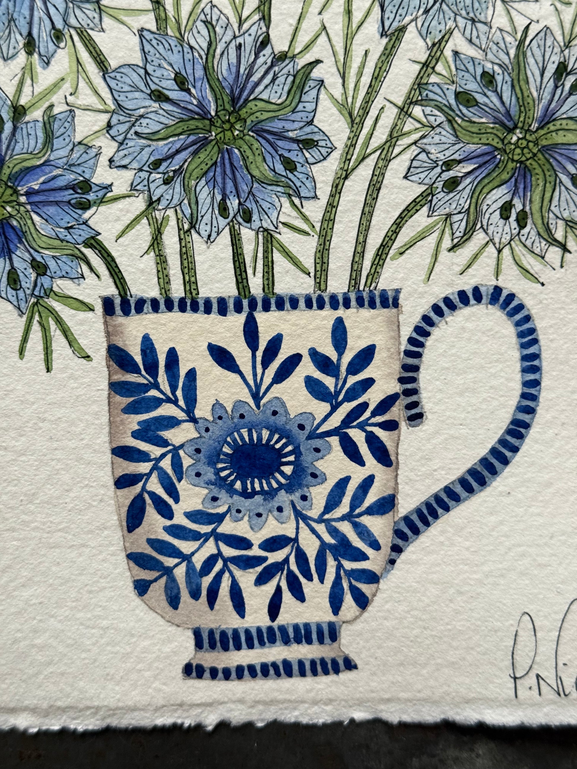 Original A5 (Approx) watercolour painting of a pretty Love in a Mist flowers arranged in a little delft inspired teacup. The flowers and leaves are decorated with a delicate layer of black ink pattern detail.