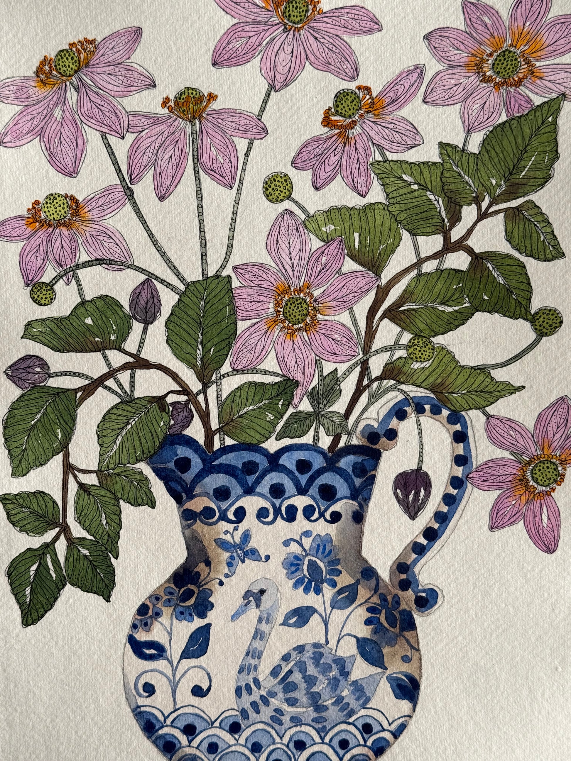 Original A4 (Approx) watercolour painting of a collection of beautiful pink Anemone flowers and foliage arranged in a blue and white, delft inspired vase with a swan taking centre stage. The flowers ans foliage are decorated with a delicate layer of black ink pattern detail.